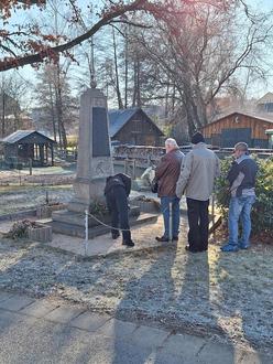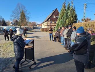 Nur 15 Teilnehmer waren am 23.11. bei strahlendem Sonnenschein zur Gedenkfeier für die Toten beider Weltkriege nach Ehrenberg gekommen. Gerlinde Elstner, Dirk Schaffrath und Daniel Brade hielten Ansprachen. Die Ansprachen wurden durch die Elbsandsteiner Blasmusikanten begleitet. Im Anschluss legten die Anwesenden Gestecke und Blumen nieder. 18 Männer aus Ehrenberg verloren im Ersten und 44 im Zweiten Weltkrieg ihr Leben. Die Gedenktafel von 1939 bis 1945 an der Friedhofshalle soll zukünftig mit an das Denkmal am Kirchsteig kommen.