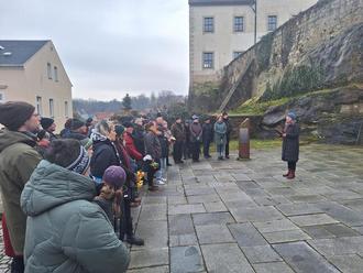 Unter den Anwesenden war auch Gabriele Hahn, die Enkelin von Konrad Hahnewald, dem Burgwart, der 1933 zum ersten Häftling des frühen Konzentrationslagers auf der Burg Hohnstein wurde. So erinnerte die diesjährige Rednerin Theres Schimansky aus Hohnstein an den Ort der Anfänge von systematischer Unterdrückung, Verfolgung, Inhaftierung und Misshandlung von Andersdenkenden und politischen Gegnern der Nationalsozialisten. Denn auch hier im kleinen Städtchen Hohnstein begann, was sich dann bis zum Kriegsende in seinem unfassbaren Ausmaß zeigen sollte. Unermessliches Leid und millionenfacher Tod waren das Ergebnis. Bürgermeister Daniel Brade berichtete von seinen beklemmenden Eindrücken beim Besuch des Holocaust-Museums in Washington/USA im November letzten Jahres. Roland Döring aus Ulbersdorf ergriff das Wort und erinnerte an den Widerstandskämpfer Walter Zirnstein aus Ulbersdorf, der vor 80 Jahren im Jahr 1945 als Strafsoldat im Kriegsgefangenenlager an Fleckfieber starb. Es war ihm wichtig, dass diese Menschen, die aktiv Widerstand leisteten, nicht vergessen werden.