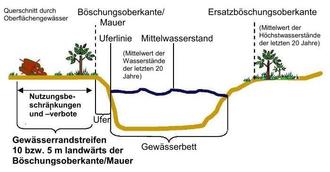 Die Breite der Gewässerrandstreifen beträgt beidseits landwärts im Anschluss an das Ufer 10 m, innerhalb im Zusammenhang bebauter Ortsteile 5 m.