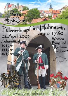Am Sonnabend, dem 22. April 2023 geht es zurück in den „Siebenjährigen Krieg“. Die Burg Hohnstein wird 10 Uhr erobert, 15 Uhr zurückerobert und 20 Uhr findet ein Versöhnungsspektaktel im Feuerschein an der Burgmauer am Marktplatz statt. Im Burggarten schlagen die historischen Darsteller ihr Lager auf. Dort ist auch für Speis und Trank gesorgt. Lassen Sie sich dieses Ereignis nicht entgehen!