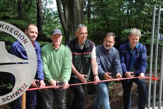 Der verantwortliche Planer Lucas Schmitt, Ralf Kaiser, der die meisten schwere Tragearbeiten geleistet hat, Uwe Borrmeister, Leiter der Nationalpark- und Forstverwaltung Sächsische Schweiz, Roman Rolof, Bürgermeister von Kurort Rathen, Torsten Grämer von Metallbau Lottes (v. l.) durchschneiden gemeinsam das Band zur Wiedereröffnung des Wanderwegs durch die Schwedenlöcher in der Nähe der Bastei im Nationalpark Sächsische Schweiz.
