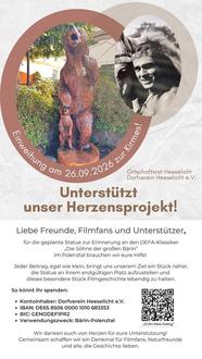 Am 30. August kam der 85-jährige Schauspieler Gojko Mitic nach Heeselicht, um mit dem Ortsvorsteher, dem Ortschaftsrat und den beiden Bürgermeistern aus Stolpen und Hohnstein über die Dreharbeiten zu sprechen. Wir wollen an das Ereignis erinnern und nach 60 Jahren eine Bärin aus Holz an der Wiese im Polenztal aufstellen sowie eine Erinnerungsstele. Der Ortschaftsrat sammelt nunmehr Spenden zur Finanzierung. Zur Kirmes am 26.09.2026 in Heeselicht soll alles eingeweiht werden. Dann wird auch Gojko Mitic das nächste Mal dabei sein und für alle zur Verfügung stehen. Wir suchen noch Darsteller von damals. Melden Sie sich bei uns. Anbei veröffentlichen wir den Spendenaufruf.