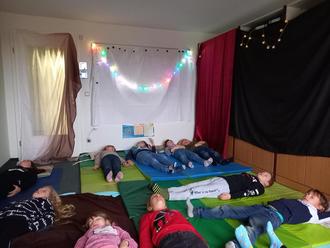 Das Lehrerzimmer wurde liebevoll mit Tüchern, Decken, weichen Kissen und Matten sowie kleinen Lichtern und Lichterketten in einen Entspannungsraum verwandelt. Auch bei dieser Station, genannt Chillout entspannten die Schüler beim Kinderyoga mit Musik.