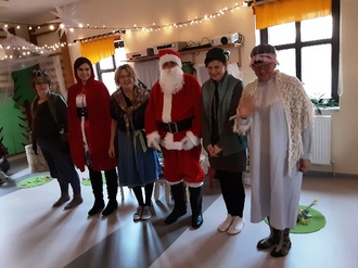 Der Mann mit dem Rauschebart freute sich sehr über all die dargebrachten Lieder und Gedichte. Vorher allerdings erfreuten die Erzieherinnen alle mit dem traditionellen, weihnachtlichen Märchenspiel. Dieses Mal war die Großmutter krank und rief per Telefon um Hilfe! Ihr ahnt schon, wer geholfen hat. Richtig: das „Rotkäppchen“. Und wenn auch der böse Wolf großen Hunger verspürte, ging die Geschichte doch noch gut aus! „Ende gut, alles Gut!“ könnte man sagen. Es ist eben ein Märchen, in denen siegt immer das Gute über dem Bösen!