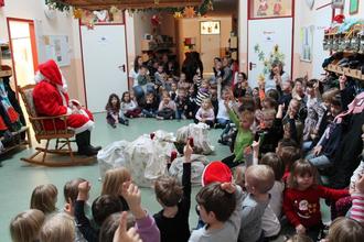 Im Anschluss trafen wir uns alle im Foyer der Kita. Da stand ein Schaukelstuhl. Wofür der wohl gedacht war? Plötzlich klopfte es an der Tür und ein weiser Mann mit rotem Anzug stand auf einmal vor den Kindern. Es war unser Weihnachtsmann. Er begrüßte die Kinder herzlich und nahm Platz. Die Augen der Kinder leuchteten und gemeinsam sangen wir ein Lied zur Weihnachtszeit. Unser Weihnachtsmann bedankte sich und übergab den Erzieherinnen jeweils einen Sack mit Geschenken für die Gruppen. Er hatte sogar noch für jedes Kind eine Kleinigkeit mitgebracht, die er an die Kinder verteilte.