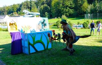 Ab 14.30 Uhr trafen die Familien nach und nach ein. Nachdem sich die meisten mit Kaffee und Kuchen versorgt hatten, wurden die Kinder von der „Hexe Gundula“ begrüßt. Sie unternahm mit ihnen eine „Reise in das Reich der Tiere“. Da die Tiere plötzlich fremde Stimmen hatten, brauchte Gundula die Unterstützung der Kinder, um allen Tieren ihr richtige Stimme wiederzugeben. Mit einfachen Mitteln und wunderbar kreativen Requisiten zog die Hexe ihre kleinen Zuschauer in ihren Bann.