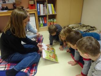 Am 17.11. gab es aber noch viel mehr Geschichten zum Zuhören. Anlässlich des bundesweiten Vorlesetages besuchten uns SchülerInnen der 8. Klassen aus der Oberschule Halsbrücke und dem Geschwister-Scholl-Gymnasium Freiberg sowie eine Auszubildende und ehemalige Praktikantin vom Beruflichen Schulzentrum Freiberg. Mitgebracht hatten sie tolle Bücher aus der Stadtbibliothek Freiberg und auch ein klein wenig „Lampenfieber“. In kleinen Gruppen lasen sie den aufmerksamen Zuhörern vor und schauten gemeinsam die Bilder zu den Geschichten an. Manche begeisterten Kinder konnten gar nicht genug bekommen und forderten „Noch eine Geschichte!“.