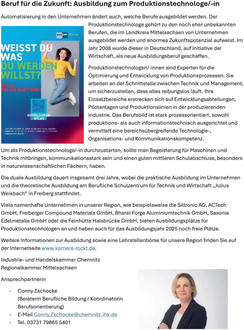 Viele namenhafte Unternehmen in unserer Region, wie beispielsweise die Siltronic AG, ACTech GmbH, Freiberger Compound Materials GmbH, Bharat Forge Aluminiumtechnik GmbH, Saxonia Edelmetalle GmbH oder die Feinhütte Halsbrücke GmbH, bieten Ausbildungsplätze für Produktionstechnologen an und haben auch für das Ausbildungsjahr 2025 noch freie Plätze.