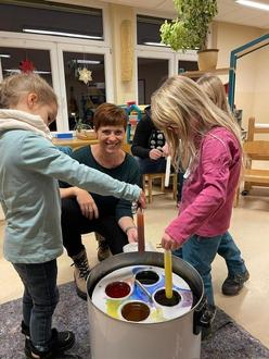 Wer es gemütlich und warm bevorzugte, fand in unserem weihnachtlichen Café ein schönes Plätzchen. Bei Kaffee, Kuchen und belegten Brötchen konnte man sich aufwärmen und mit anderen Besuchern ins Gespräch kommen. In den Gruppenräumen konnten die Kinder mit ihren Eltern verschiedene Bastelangebote in Anspruch nehmen. Das Angebot reichte von Kerzen tauchen über Zapfen mit Naturmaterialien gestalten und wuschelige Rentiere aus Bommeln basteln. Wer einfach nur genießen wollte, der konnte sich bei einer Klanggeschichte entspannen oder das Puppentheater mit der Vorstellung „Jan und Henri“ besuchen. Hier war sicher für jeden etwas dabei.