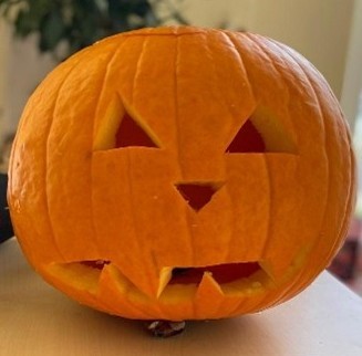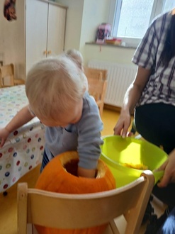 Zum Start erforschten wir im Morgenkreis verschiedene Kürbisse – welche essbar sind, wie sie aussehen, riechen und sich anfühlen. Danach wurde es kreativ: Beim Schnitzen entstanden mit viel Eifer lustige und gruselige Kürbisgesichter, die unseren Eingangsbereich schmückten.