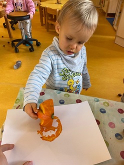 Zur Wochenmitte duftete es herrlich im Haus, als wir gemeinsam einen leckeren Kürbiskuchen backten. Am Donnerstag wurde mit halben Kürbissen und Farbe gedruckt – tolle Kunstwerke entstanden!