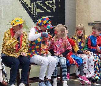 Clowns im Warteraum, die sich um die besten Plätze drängten.