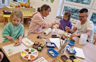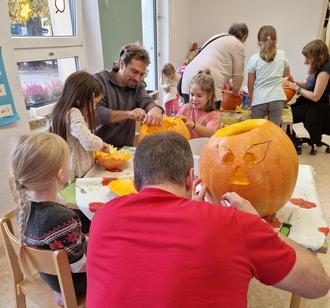 Am 24.10. haben wir unser Herbstfest gefeiert. Alles drehte sich um die Kartoffel und den Kürbis. Zu Beginn war das Kaffee- und Kuchen-Buffet sehr gut besucht und auch die Quark-Bar von unserer wunderbaren "Oma Renate" war ein absolutes Highlight. Zu Pellkartoffeln konnte jeder Gast seinen Quark nach Herzenslust mit frischen Kräutern, Gewürzen und Gemüse aufpeppen. Das schmeckte Groß und Klein und nebenbei erfuhr man viel über die gesunden Kräuter und ihre Nutzung. Nachdem alle den ersten Hunger gestillt hatten, ging es zum Kürbisschnitzen und Basteln. Im Laufe des Nachmittags entstanden tolle Kürbisgesichter, Teelichter und mit Kartoffeln bedruckte Tüten. Nebenher war auch Zeit zum Spielen und für einen Plausch. Die Nachfrage nach den Schnitzkürbissen war so groß, dass wir sogar noch Nachschub besorgen mussten.