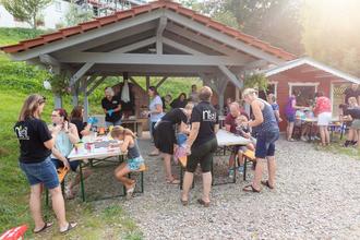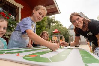 Vereinsmitglieder und Kinder aus dem Dorf beim Gestalten von großen Spielbrettern, Copyright Bianka Behrami