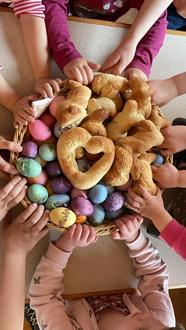 Am 26. März war es bereits so weit. Daniela Friedemann und ihr Team luden zum traditionellen Osterbacken ein. Die kleinen Bäckerinnen und Bäcker rührten, kneteten und formten den Teig zu lustigen Osterfiguren und so manches Kunstwerk wurde noch in der Erzwäsche vernascht. Für ein buntes Osternest wurden Eier in den verschiedensten Farben gefärbt und anschließend mit einem Abziehbild verziert. Überzeugt euch selbst, was die kleinen Hände Großes geschaffen haben, auf dem Bild fehlt nur der verführerische Duft, welcher durch die Räume der Erzwäsche zog.