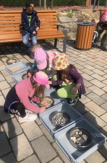 Durch das Sieben von verschiedenen Gesteinsgrößen durch Siebe mit unterschiedlichen Maschenweiten, fanden die Kinder anschaulich heraus, dass Sand nichts anderes als ganz kleine Steine sind. Auch entdeckten sie, dass jede Gesteinsart einen anderen Klang ausweist. Bei der Suche von Schatztruhen im Sand zeigten alle viel Geduld, damit auch ja keine übersehen wird. Stolz packten die Kinder ihre Andenken in die Rucksäcke.