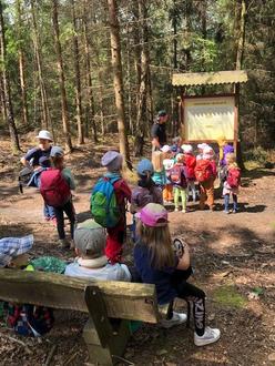Langsam fragten die Kinder ungeduldig, wann denn endlich die versprochene Lavasteinstelle kommt. Endlich angekommen, rieben alle Kinder 2 Lavasteine aneinander. Und siehe da, wir konnten den durch die Reibung entstandenen speziellen Geruch mit unseren Nasen erschnüffeln und die Hosen – und Jackentaschen wurden wieder schwerer. Doch auf unserer Wanderung lernten wir nicht nur Dinge zu bzw. über Steine kennen. Die auf unserem Weg im Wald angebrachten Informationstafeln regten uns dazu an, auch einiges über den Wald selbst zu lernen. So lösten die Kinder beispielsweise ein Rätsel zu Baumarten, zählten Jahresringe, erhielten Informationen zu den Funktionen des Waldes und vieles mehr.