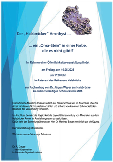 Goldschmiede-Meisterin Andrea Gerlach aus Niederschöna wird im Anschluss über ihre Arbeit mit diesem Schmuckstein erzählen und anhand von kreativen Schmuckstücken Beispiele der Verwendung vorstellen.