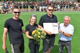 Die Ehrung übernahm der Präsident des Kreisverbandes Thomas Pretschner im Beisein von Mathias mit Ehefrau Bianka und unserem Abteilungsleiter Fußball Dominic Thierbach. v. r. n. l.