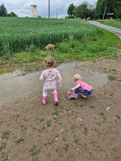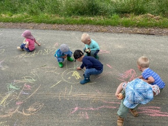 Kaum hatte sich der Regen verzogen, machten sich alle Kinder und Erzieher auf den Weg ins Grüne. Nach einem leckeren Picknick mit vielen mitgebrachten Naschereien, konnten sich alle noch etwas in der Natur austoben. Auch Pfützen wurden dafür genutzt. Einige Kinder verschönerten mit Kreide die Straße oder lauschten der Partymusik. Somit war für jeden etwas dabei und es war ein rundum gelungener Ausflug.