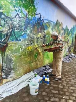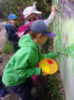 Zum 70. Kita-Geburtstag hatten wir uns eine große Leinwand, bemalt mit einer Waldlandschaft, vom Theater Freiberg geliehen. Diese bildete eine wunderschöne Kulisse für unsere Bühne und wurde von unseren Gästen, aber auch von uns selbst bestaunt. Nach der Feier mussten wir diese schöne Leihgabe wieder zurückgeben und die Wand wurde wieder blass. Das sollte nun geändert werden. Nach kurzer Ideensammlung wurden wir, dank des Hinweises einer Mutti, auf Herrn Grahl aufmerksam. Fast über Nacht hat er uns eine Skizze geschickt, die uns sofort überzeugte - und schon ging es los mit der Wandmalerei. Das Highlight für die Kinder war, selbst den Pinsel zu schwingen und gemeinsam mit Herrn Grahl die Wand zu gestalten. Was dabei herausgekommen ist?