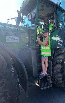 Eines der Highlights war die Fahrt mit dem Traktor und dem Radlader, wo jedes Kind einmal mitfahren durfte. Es war eine große Herausforderung für die Kinder den Traktor zu erklimmen, da der Aufstieg auf einen echten Traktor sehr hoch ist.
