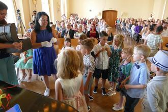 22 erwartungsvolle Schulanfänger mit ihren Eltern, Großeltern und Gästen sowie nicht minder aufgeregte Programmkinder mit ihren Lehrerinnen bevölkerten die traditionell geschmückte Aula der Oberschule Halsbrücke. Nachdem sich alle Gäste von ihren Plätzen erhoben hatten, sorgte der musikalische Einmarsch unserer Schulanfänger für erste Gänsehautmomente. Wird es dieses Jahr große Zuckertüten geben? Diese Frage beschäftigte die neuen Schulkinder am meisten. Da konnten nur Zauberkräfte helfen, also musste Hexe Mirola ihr Können unter Beweis stellen. Aus den Schnupperstunden war die Hexe mit dem roten Hut den Kindern bestens bekannt. Bereitwillig öffnete sie ihre Schatztruhe und jedes Kind bekam eine kostbare Zaubermuschel.