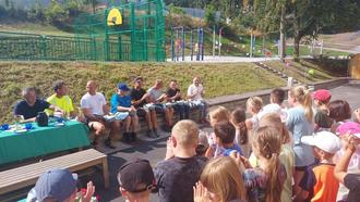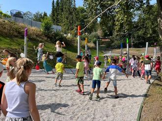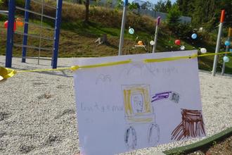 Voller Vorfreude warteten unsere Grundschüler auf die Freigabe und somit Inbesitznahme des Spielplatzes. Bisher konnten nur die Nasen an den Fensterscheiben plattgedrückt und die tollen neuen Spielgeräte beäugt werden. Nun war es endlich so weit. Ganz wichtig war es dabei, Danke zu sagen.