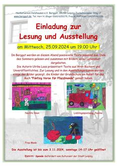 Die Autorin und Vereinsmitglied Ulrike Loos präsentiert Bilder, die Kinder der Grundschule „Am Rabet“ für ihr Buch „Fünfzig Verse für Pferdinande“ gemalt haben. Gezeigt werden diese Bilder voller Lebenslust bis 03.11.2024.