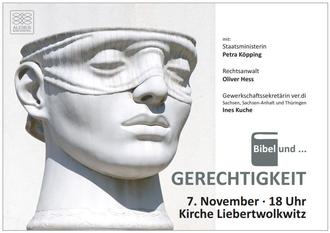 Gemeinsam mit Staatsministerin Petra Köpping, Rechtsanwalt Oliver Hess und Gewerkschaftssekretärin (ver.di) Ines Kuche wenden wir uns dem Thema “Bibel und Gerechtigkeit” zu. Dabei werden die biblischen Gerechtigkeitsauffassungen ebenso Raum finden, wie die, die uns alltäglich begegnen - auf dem Podium werden unsere Gäste über das Empfinden sozialer Gerechtigkeit und das Durchsetzen von Recht und Gesetz dikutieren. Und so Gott will, werden wir gemeinsam der Frage nach einer größeren Gerechtigkeit nachgehen.