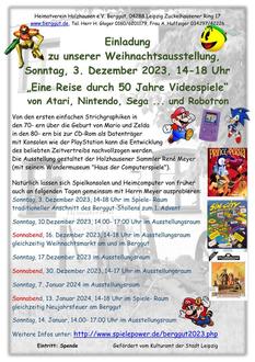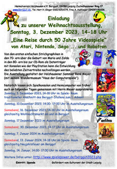 Der Holzhausener Sammler René Meyer zeigt uns mit seiner Wanderausstellung „Haus der Computer“ einen kleinen Teil seiner historischen Heimcomputer und Spielekonsolen. Er bietet die Möglichkeit, diese auszuprobieren. Geöffnet ist die Ausstellung an den Adventssonntagen (außer 4. Advent) und zu unseren Veranstaltungen zuzüglich am 30.12.2023, 07.01.2024 und 14.01.2024 von 14.00 Uhr bis 17.00 Uhr.