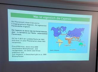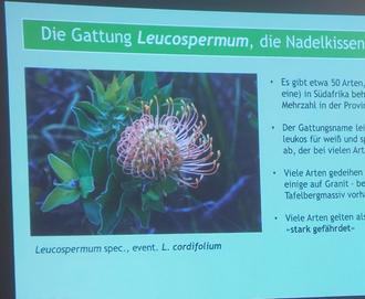 Am Mittwoch, d. 15.11.2023 hat uns unser Vereinsmitglied und leidenschaftlicher Fotograf Wolfgang Teschner einen bildgewaltigen Vortrag über seine Exkursion an die Südspitze Afrikas geboten. Die Reise ging mit Studenten der Botanik in die florenreiche Capensis. Es ist das kleinste und zugleich artenreichste Pflanzengebiet der Welt. Vorgestellt wurde der Fynbos „feiner Busch“. Ein mediterranes Gebiet mit prächtigen Blüten wie die bekannte Protea. Vielen Dank für die wunderschönen Aufnahmen!