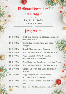 Mehr als 45 kleine und große Verkaufsstände mit duftenden Leckereien und handgefertigten Geschenken erwarten die Besucher auch in diesem Jahr bei unserem „Weihnachtszauber am Berggut“. Um 14 Uhr eröffnen der Weihnachtsmann und Frau Holle mit ihrer Gold- und Pechmarie den heimeligen Markt, der mit allerlei Attraktionen wie Eisenbahn und Karussell, Märchenerzähler und Puppenspieler, Glühwein und Bratwurst für eine besinnliche Vorweihnachtsstimmung sorgt.