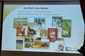Der Wolf ist in Deutschland immer noch präsent in Namen wie Wolfshain, Wolfgang, Familie Wolf oder in Stadtwappen. 105.000.000 Einträge gibt es in Deutschland bei Google zum Thema Wolf. Ausgerottet wurde er hier im 18./19. Jahrhundert. 1720 wurde in Leipzig der letzte Wolf gesichtet.