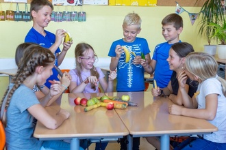 Vielleicht hat Ihr Kind schon mal zu Hause berichtet, dass es eine extra Portion Obst und Gemüse in der Schule bekommen hat. Denn unsere Schule nimmt an dem EU-Schulprogramm für Obst und Gemüse teil. Jeden Dienstagmorgen stellt unsere FSJlerin fleißig die bunten Obst- und Gemüsekörbe für die Klassen zusammen, ab 9:05 Uhr sind die Körbe für die Kinder abholbereit. Dank des Schulprogrammes werden wir wöchentlich vom HofGut Kreuma mit frischem Bio-Obst und Gemüse beliefert. Die Kinder nehmen die gesunden Snacks gerne an. Auch in der Nachmittagszeit im Hort werden die Kinder vom Hort-Team nochmals mit Nachschlag versorgt.