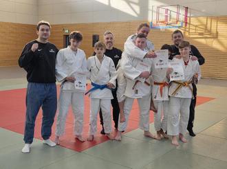 Zurück in heimischen Gefilden starteten die Jahrgänge 2011 bis 2009 bei den Bezirkseinzelmeisterschaften U18 im Sportbezirk Leipzig ins neue Wettkampfjahr. Zwar trat nur ein Teil der Trainingsgruppe an, dafür aber äußerst erfolgreich: Gold holten sich Paul Franze (46 kg) und Aramis Leopold (90 kg), beide als jüngster Jahrgang - Chapeau! Silber ging an Leni Endter (57 kg) und Mathilda Heintz (63 kg), Bronze an John Frukowski (50 kg) und Jonas Waage (+90 kg). Noah Vogel und Philipp Pawleta rundeten das Ergebnis mit starken 5. Plätzen ab. Damit lösten sechs Athleten das Ticket zu den Landesmeisterschaften Ende Januar in Rammenau. Ein großes Dankeschön ging an Trainer, Kampfrichter und alle Helfer - ohne euch läuft nichts, außer vielleicht der Schweiß.