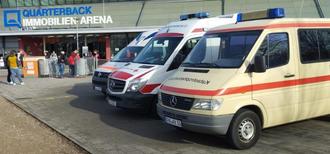 10.02.2024 - Arena Leipzig, Leichtathletikwettkampf: ehrenamtliche Sanitätsdienstkräfte - u. a. aus der Bereitschaft Mölkau-Holzhausen - stehen bereit, um im Falle von Verletzungen/Erkrankungen Sportlern und Zuschauern notfallmedizinische Hilfe zu leisten.