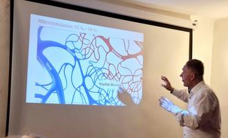 Das Thema lautete „Physikalische Gefäßtherapie“. Das Ehepaar Teyssler zeigte den Besuchern an Hand Fotos die Mikrozirkulation des Blutes der Arteriolen (die für die Zufuhr verantwortlich sind) und der Venolen (die für den Abfluss verantwortlich sind). In diesem Mikrokosmos findet die Versorgung der Zellen mit Sauerstoff, Nährstoffen u. a. und der Abtransport der Stoffwechselprodukte und Kohlendioxid statt. Diese super kleinen Gefäße müssen frei und durchlässig sein und sind somit wichtig für unsere Gesundheit. Eine Möglichkeit der Anregung der Mikrozirkulation ist die Physikalische Gefäßtherapie Bemer. Durch spezifische Magnetimpulse erfolgt die Aktivierung des Eigenimpulses dieser Gefäße auf einer Magnetfeldmatte.
