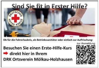 Jeder wünscht sich entsprechende Hilfe, wenn er in eine Notsituation gerät. Gerade deshalb sollte jeder auch helfen können, wenn es darauf ankommt! Der DRK Ortsverein Mölkau-Holzhausen möchte deshalb sein Objekt in der Arthur-Polenz-Str. 1 mit regelmäßigen Erste-Hilfe-Kursen mit einem neuen attraktiven Angebot weiter beleben. Wir hoffen dabei auf die entsprechende Resonanz in der Bevölkerung unserer Ortsteile. Ob für die Fahrerlaubnis, für den Beruf oder einfach als Auffrischung - Wir machen Sie fit in Erster Hilfe! Übrigens interessant für Firmen und Institutionen: In vielen Fällen kann die Aus- und Fortbildung von betrieblichen Ersthelfenden direkt mit der Berufsgenossenschaft oder Unfallkasse abgerechnet werden. Informieren Sie sich gern zu den Voraussetzungen.