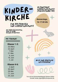 Die Kinderkirchensamstage sind einerseits für Kinder - mit einem bunten Programm und biblischen Geschichten sollen sie während dieser Nachmittage den Glauben erkunden. Die Kinderkirchensamstage sind gleichermaßen aber auch für Sie, die Eltern - mit einem freundlichen Team von Menschen aus unserer Kirchgemeinde sind Sie herzlich eingeladen, auf eine oder viele Tassen Kaffee oder Tee zu bleiben, ein bisschen Gebäck zu knuspern und fröhlich zu schwatzen. Ich bin schon sehr gespannt, was an diesen Samstagen wachsen wird! Vorfreudig, Pfr. Sebastian Schirmer