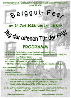 | • | Samstag, d. 24.06.2023 ab 14.00 Uhr Berggutfest |