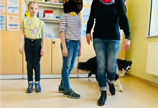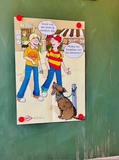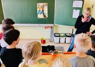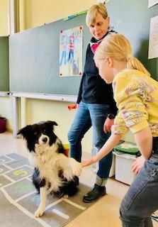 In der heutigen 4. Unterrichtsstunde beginnt ein neues Förderband für eine Gruppe der Klasse 3b. Heute darf diese Klasse ihren Hundeführerschein beginnen und innerhalb der nächsten 6 Wochen ihr Hundewissen erweitern. Als erstes werden die Stunden immer mit dem Händewaschen begonnen und auch beendet. In der allerersten Hunde-Stunde wird über wichtige Regeln im Umgang mit einem Hund gesprochen. Wichtig hierbei sind auch Verhaltensregeln bei Begegnungen mit fremden Hunden. In den nächsten Wochen bekommen die Kinder Informationen und Tipps zu Ernährung, Erziehung, Verhalten, Pflege und Co. Natürlich dürfen auch die ersten Tricks mit Enno geübt werden, dabei erhalten die Kinder gleich einen ersten guten Eindruck, wie Körpersprache und Kommandos auf Hunde wirken. Ganz nebenbei werden bei den Kindern die Wahrnehmung, Konzentration sowie Rücksichtnahme geschult und das Einhalten von Regeln geübt.