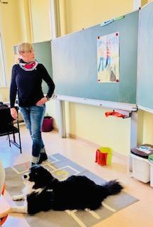Grundsätzlich ist Enno 2x in der Woche in der Grundschule Holzhausen im Einsatz und unterstützt die aktuelle Klasse 1a im Mathematik-, Deutsch- und Sachunterricht. Das beliebteste Unterrichtsfach in der Schule ist aber das Förderband „Hundeführerschein“. Den Hundeführerschein können bei uns alle Schüler erhalten. Zwischendurch, wenn z.B. der Sportunterricht für Hundemama Frau Loos ansteht, darf er im Sekretariat Pause machen und sich entspannen. Auch als Bürohund ist Enno sehr beliebt und zaubert jedem Besucher, der Schulleitung und der Schulsachbearbeiterin ein Lächeln ins Gesicht.