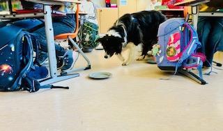 Es ist ein Dienstag - ein ganz normaler Schulalltag. Enno, unser Schulhund, ist schon seit den frühen Morgenstunden wach. Denn für Hundemama, Frau Loos, beginnt der Tag schon früh mit einem ausgiebigen Spaziergang, damit Enno für seinen Schuleinsatz gut vorbereitet ist. Pünktlich um 7 Uhr ist Enno dann auch schon in der Schule und hilft Frau Loos bei der Unterrichtsvorbereitung. Sein Frühstück bekommt er über den Tag verteilt, denn als Schulhund muss man sich sein Futter „erarbeiten“. Aber genau das liebt Enno so sehr. Enno ist ein Border Collie und möchte gefördert und gefordert werden. Das ist die ideale Auslastung für den niedlichen Fellträger.