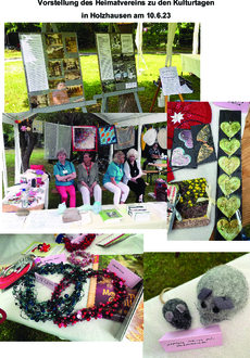 Anlässlich der Kulturtage in Holzhausen hat sich unser Heimatverein an einem Stand in Täschner‘s Garten vorgestellt. Zwei Plakate informierten die Besucher zur Geschichte des Heimatvereins. Unsere Kreativ- und Patchworkgruppe stellte ihre handwerklichen und fantasievollen Handarbeiten den Besuchern vor. Das eine oder andere Fachgespräch wurde geführt. Der Vorstand des Heimatvereins bedankt sich bei unseren Mitgliedern, daß sie an zwei Nachmittagen Zeit fanden, den Stand zu gestalten und zu betreuen.