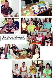 Geplant hatten wir unsere Lesung am 21.06.23 in Täschner’s Garten, aber die Wettervorhersage hat uns einen Strich durch die Rechnung gemacht. Also ab ins Berggut, das war gut besucht. Und unsere Besucher konnten auch an diesem Tag wieder ihre „Lach- Dosis“ abholen, vollkommen rezeptfrei und ohne Termin. Der Autor U. S. Levin zeigte uns seine Sicht auf das Gesundheitswesen (z. B. Reha, Kur ...) oder das Arzt- Patienten- Gespräch. Oh wehe - es schmerzt, dann aber ab zum Doktor. Der Abend wurde brilliant vom Hypochonder gestaltet. Die Quintessenz dieses abends - lachen ist gesund. In diesem Sinne auf ein Neues 2024!