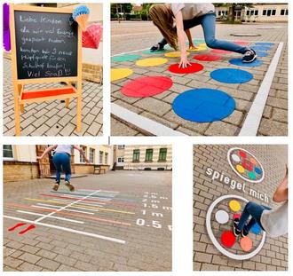 Die Schüler haben einen großen Anteil an diesem Erfolg. Als Dankeschön für die Mithilfe haben wir über die Firma Prefatherm bunte Hüpf- und Bewegungsspiele auf dem Schulhof aufbringen lassen. Ab sofort können 3 neue Spiele im Bereich vor der Turnhalle ausprobiert werden: „Twister“, „Spiegel mich“, und „Standsprung“.