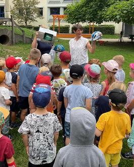 Fahrzeuge stehen bei allen Kindern hoch im Kurs. Schon in der Krippe sind Bobbycar, Roller und Laufrad extrem beliebt. Nicht anders sieht es im Kindergarten, bei den 3- bis 7-Jährigen aus. Der Unterschied besteht lediglich darin, dass Kinder im Handling mit Fahrzeugen immer sicherer werden und damit auch die Geschwindigkeit und die Risikobereitschaft stetig steigen. Wer kennt es nicht wie frei man sich fühlen kann, wenn einen der Sommerwind um die Nase weht und die Landschaft an einem Vorbeirauscht ... Aber wie schaut es mit der Sicherheit aus? - Genau dazu haben wir uns als Kita Gedanken gemacht und entwickeln im Moment ein neues Verkehrskonzept für alle Kinder. Nicht nur die Verkehrsregeln sollen gelernt werden, nein auch die Sicherheit steht dabei stark im Fokus. So konnten wir eine echte Verkehrsampel im Garten installieren, haben die Verkehrsführung angepasst und Parkplätze für Fahrzeuge gestaltet. Auch die Anfrage bei diversen Fahrrad-Fachmärkten hatte Erfolg. So haben wir Radhelme gesponsert bekommen und freuen uns nun, dass unsere Kinder das Fahrzeugführen noch sicherer gestalten können. Einen besonderen Dank möchten wir daher an den Fahrradmarkt Stadler richten, der uns mit 10 neuen Helmen ausgestattet hat. Weiterhin auch ein großes Dankeschön an unseren Förderverein, mit dem wir gemeinsam unser Ampelprojekt realisieren konnten. Besonders geschult werden nun noch die Vorschulkinder durch das Projekt „Aufgepasst mit ADACUS“ über die ADAC-Stiftung. Alles in allem hoffen wir damit unsere Kinder auf eine sichere Teilnahme im Straßenverkehr vorzubereiten. In diesem Sinne wünschen wir allen Lesern - Allzeit gute Fahrt!
