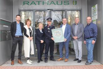 Den Kalender als Symbol für die Unterstützung bei der Finanzierung einer Alarmanlage für das Feuerwehrgerätehaus nahm der stellvertretende Gemeindewehrleiter Volker Kramer von Frank Meyer entgegen. Mit dabei waren neben der Gemeindebürgermeisterin Steffi Trittel (3. von rechts) und ihrem Nachfolger Andreas Burger (2. von rechts) außerdem Sascha Pilz von der ÖSA (links) sowie Corinna Neuhoff und Rüdiger Schmidt aus dem Bauamt der Gemeinde (rechts).