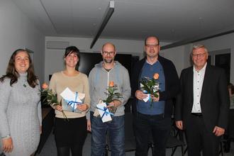 Am Rande der Kulturausschuss-Sitzung übergaben die Ausschussvorsitzende Anne Libbe (links) und Bürgermeister Andreas Burger (rechts) die Gewinne an Sophie Tiesler, Torsten Kahle (stellvertretend für Sarah Nicklas) und Mathias Assel (von links nach rechts).